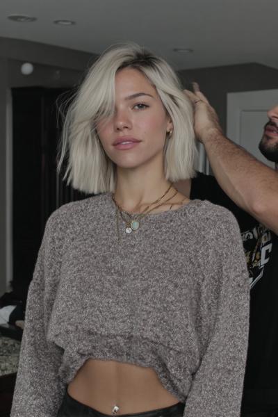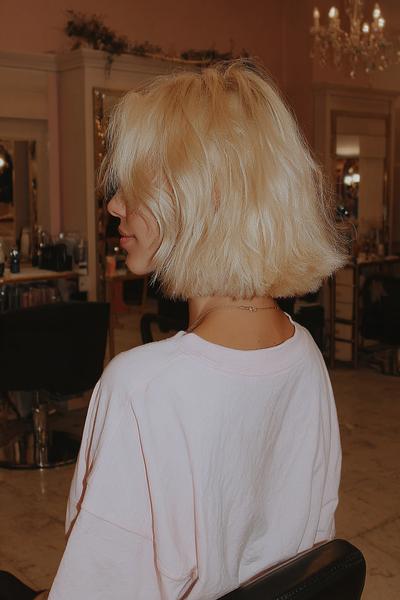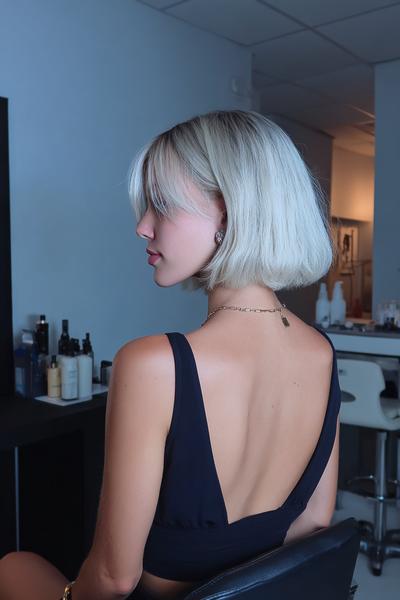 Dieser kühle Blondton glänzt auf einem sleeken Mini-Bob mit zarter Seitenfranse. Mit Rundbürste leicht einrollen, dann etwas Glanzspray – so entsteht diese weiche Kante und ein edler, ruhiger Look.