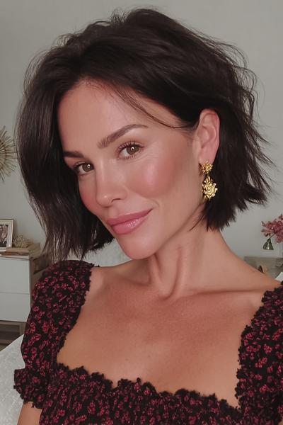 Dieser kürzere Bob lebt von Soft-Waves und einem lässigen Seitenschwung. Ich tucke eine Seite hinter’s Ohr, fixiere mit flexiblem Spray – das öffnet das Gesicht und betont die Halslinie.