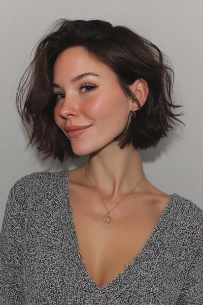 Hinten kurz, vorn minimal länger – dieser Bob zeigt sanfte Beach-Waves und eine klare, stumpfe Kante. Ich liebe das leicht salzige Finish; es schenkt Struktur, ohne die Bewegung zu beschweren.