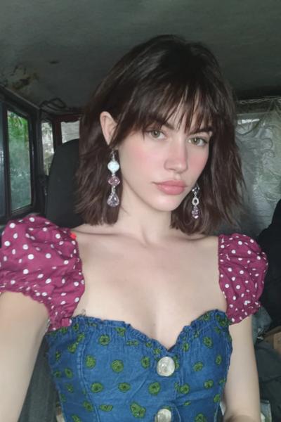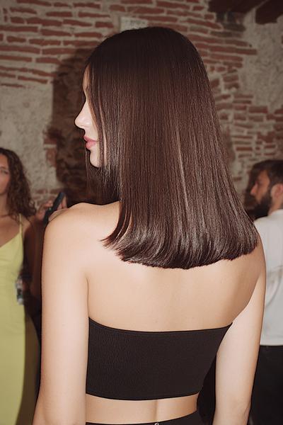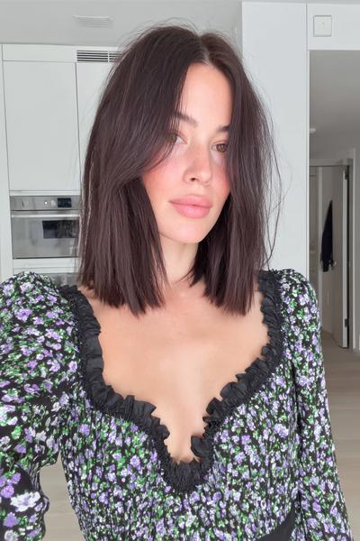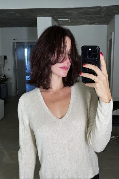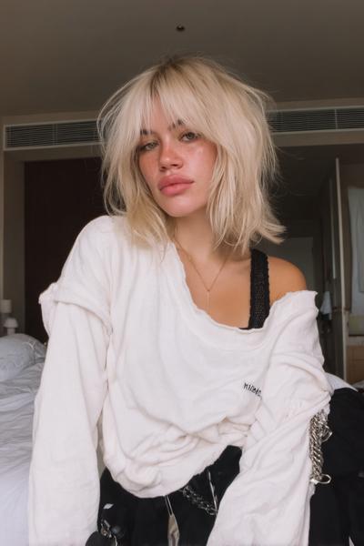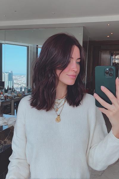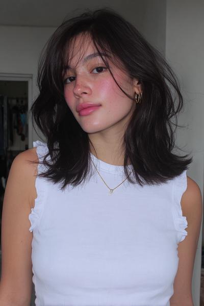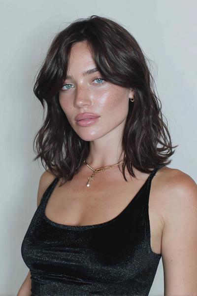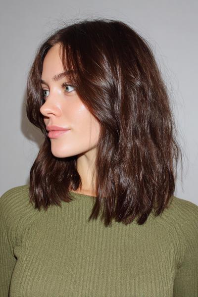 Ein zerzauster Long Bob mit Bottleneck-Bangs und tonnenweise Bewegung. Ich liebe das matte Finish: ein Hauch Trockenshampoo, Scrunching, fertig – ergibt diesen coolen, sonnengeküssten Vibe.
