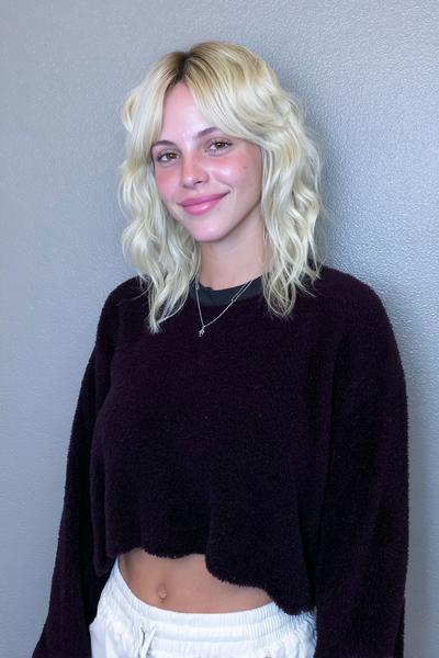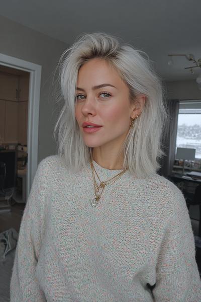 Der kühle Platin-Ton strahlt, während der sanfte Ansatzschatten Tiefe schenkt. Ich föhne über Kopf, dann Polishing-Cream – so bleibt die luftige Fülle den ganzen Tag.