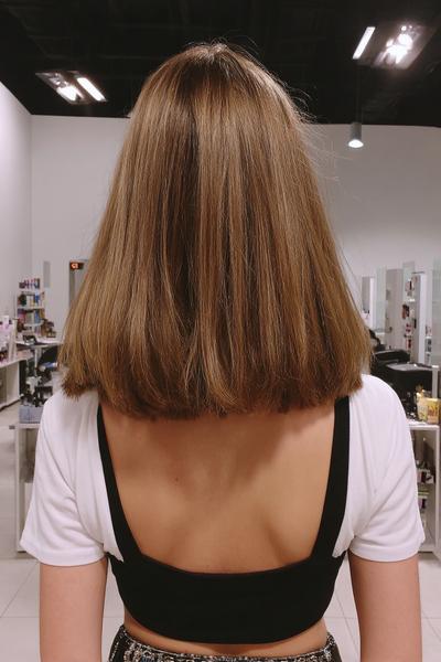 Von hinten zeigt sich die Präzision: eine kompakte, stumpfe Kante, die den Nacken elegant rahmt. Ich arbeite mit Hitzeschutz und Glanzspray – so bleibt der Long Bob clean, modern und erstaunlich pflegeleicht.