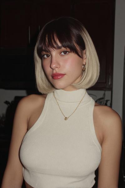 Ich liebe diesen präzisen Bob: die klare Kinnlänge umrahmt das Gesicht, während das zweifarbige Color-Blocking und der sanfte Pony dem Look sofort Grafik und Eleganz geben.