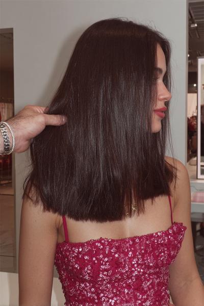 Ich liebe diese messerscharfe Kante und den glasigen Shine. Mit Heat-Serum, flachem Eisen und kühlem Luftstoß wird der Look ultra-clean – ein Statement, das ohne Worte wirkt.