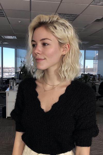 Dieser Blunt Bob lebt von kühlen Blondnuancen und Undone-Waves. Ich arbeite Texturspray ins feuchte Haar, scrunche, fertig. So entsteht Volumen ohne Schwere – chic fürs Büro, lässig fürs Afterwork, null Overstyling.