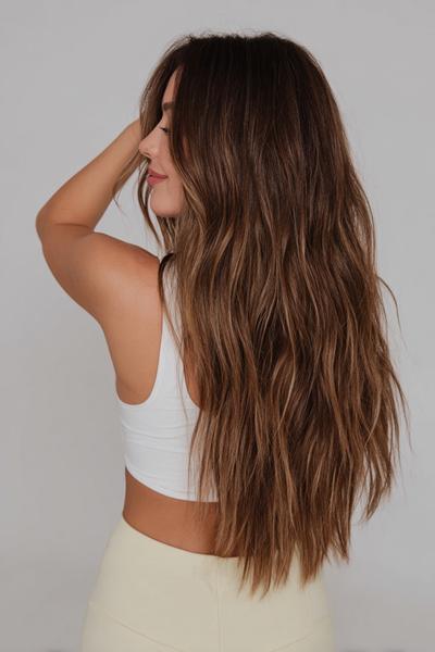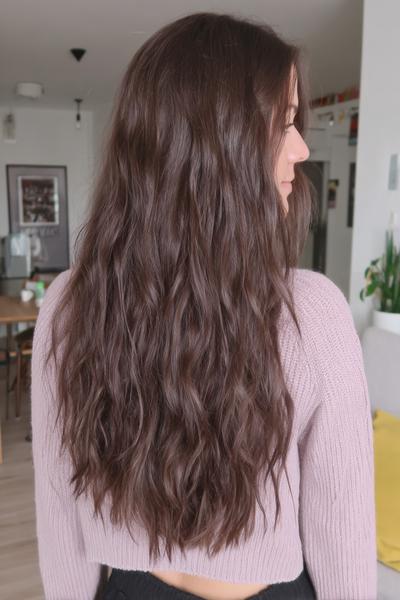 Diese mittellangen Wellen leben von weichen Stufen und subtiler Balayage. Ich style sie fast nur mit Leave-in und Scrunching – so bleibt Bewegung und ein natürlicher Glanz, ohne die Längen zu beschweren.