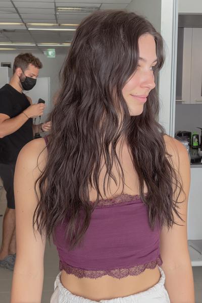 Ich sehe hier großartige Grundlänge und Textur – perfekt, um auf mittellang zu kürzen. Mit weichen, face-framing Stufen und leichten Wellen entsteht ein luftiger Look, der Volumen zaubert und den Alltag mühelos chic macht.