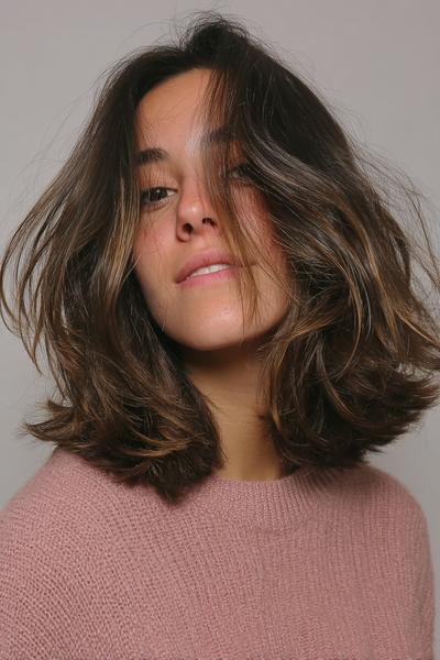 Ich liebe diesen mittellangen Shag-Lob: luftige Stufen, sanftes Face-Framing und ein natürlicher Ansatz geben ihm Charakter. Mit leichten Beach-Waves wirkt er mühelos modern – perfekt für Busy Days.