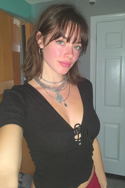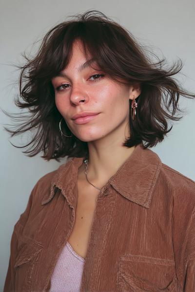 Dieser freche, mittellange Shag lebt von unregelmäßigen Wellen und weichen Mini-Bangs. Ich knete Lockencreme in die Spitzen, dann diffuser. Perfekt für alle, die Textur und Persönlichkeit zeigen wollen.