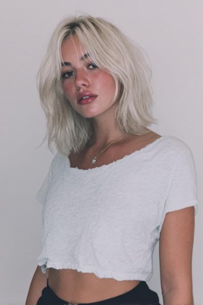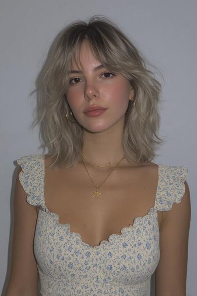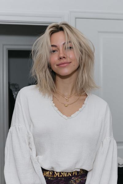Ein frecher, mittellanger Blond-Shag mit Shadow-Roots: Das lived-in Feeling macht ihn modern. Mit Wachs an den Spitzen und sanftem Scrunching entsteht eine lässige Kante – ohne an Weichheit zu verlieren.