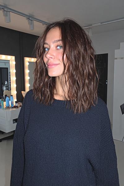 Ein wilder, mittellanger Textur-Bob mit natürlichem Schwung. Ich arbeite Volumenpuder am Ansatz ein, scrunche die Längen – fertig ist die lässige, frische Wochenend-Energie.