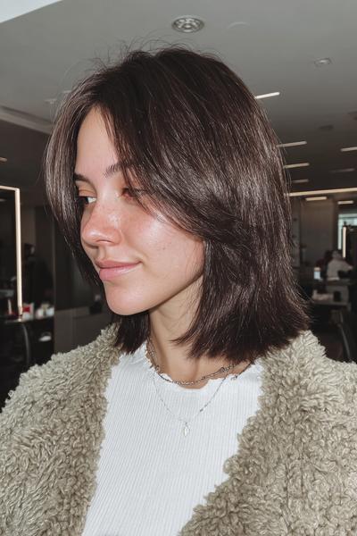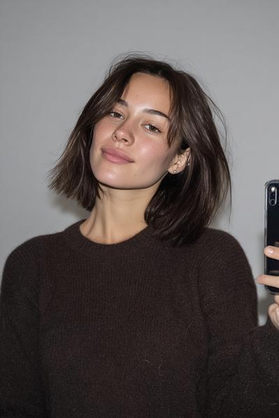 Ich liebe diesen mittellangen Schnitt: sanfte Face-Framing-Layers und ein luftiger Vorhangpony. Föhnt die Spitzen leicht nach innen, etwas Volumenspray am Ansatz – fertig ist die elegante, unkomplizierte Everyday-Frisur.