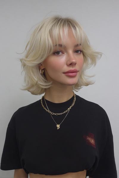 Platinblonder, mittellanger Butterfly-Shag mit schwungvollen Spitzen und weichem Vorhangpony. Ich föhne lagenweise nach außen, fixiere mit flexiblem Spray – Ergebnis: federnde 70s-Energie, aber super tragbar.