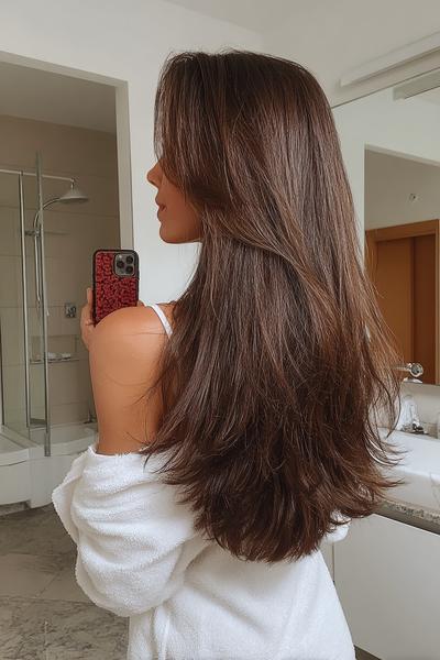 Dieser mittellange Schnitt mit sanften Layers und dezenter Gesichtsrahmung ist ein Allrounder. Ein Hauch Hitzeschutz, dann glatt über die Bürste – clean, edel, alltagstauglich.