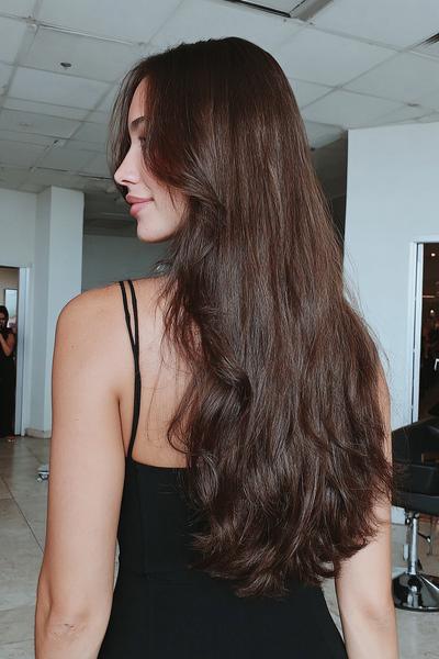 Die langen, schokoladigen Wellen wirken weich und luxuriös. Ich arbeite gern mit großem Lockenstab und Glanzspray, dazu dezente Face-Framing-Stufen – modern, aber natürlich. Perfekt für Alltag und Date Night.