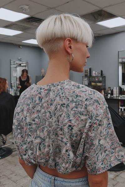 Der platinblonde Bowlcut trifft auf cleanen Undercut – grafisch, mutig, ultramodern. Ich halte die Konturen mit Maschine #1 eng, kühle das Blond mit Silbertoner. Styling: Texture Powder, fertig.
